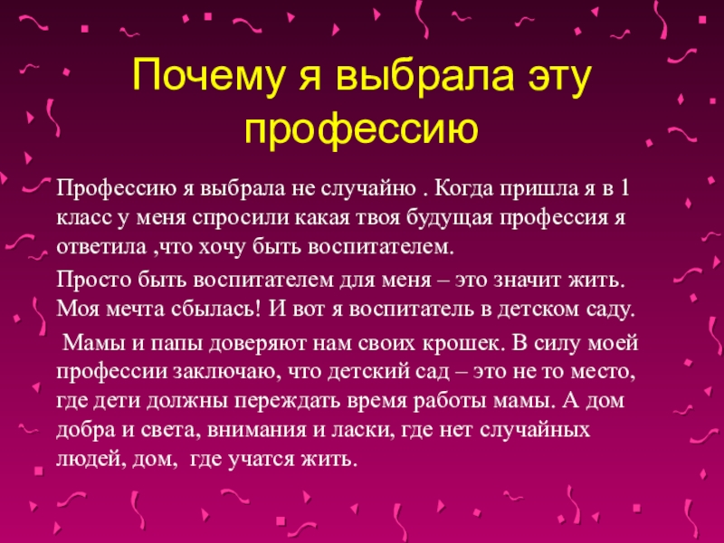 какая твоя будущая профессия я ответила ,что хочу быть воспитателем.Просто быть воспитателем для меня – это значит жить. Моя мечта сбылась! И вот я воспитатель в детском саду.