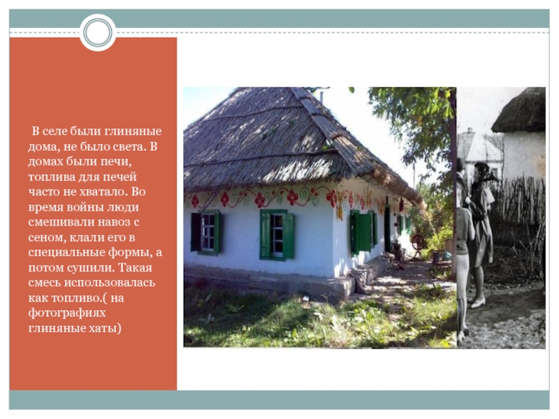 время войны люди смешивали навоз с сеном, клали его в специальные формы, а потом сушили. Такая смесь использовалась как топливо.( на фотографиях глиняные хаты)