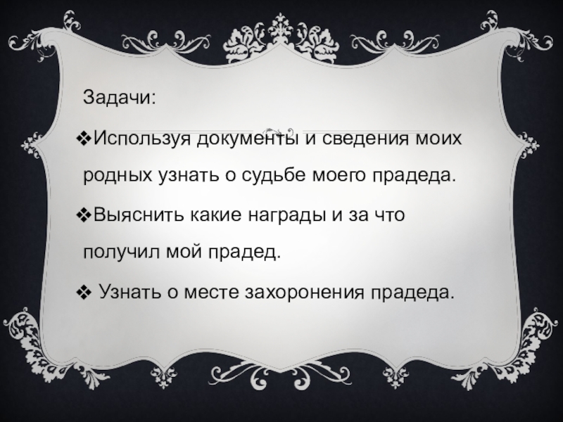 Задачи:Используя документы и сведения моих родных узнать о судьбе моего прадеда.Выяснить какие награды и за что получил