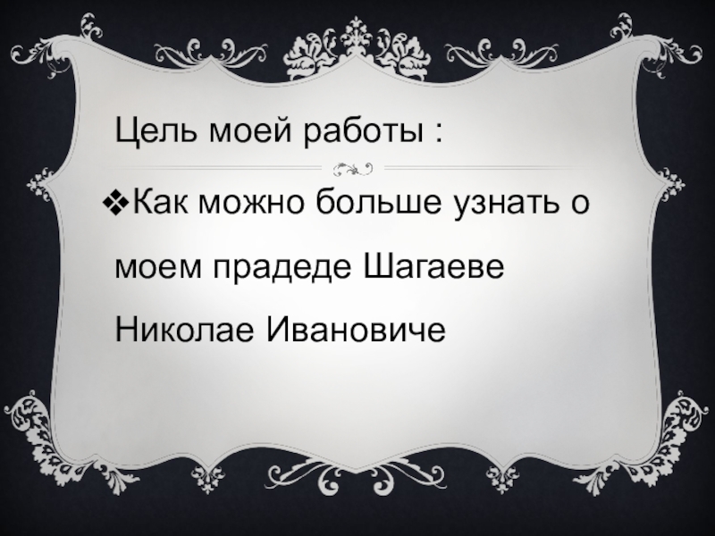 Цель моей работы :Как можно больше узнать о моем прадеде Шагаеве Николае Ивановиче