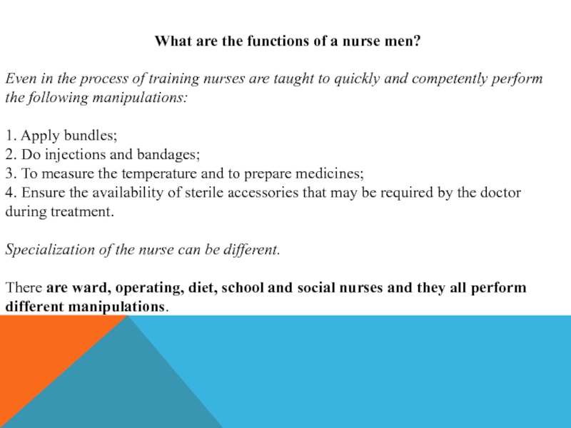 There are ward, operating, diet, school and social nurses and they all perform different manipulations.
