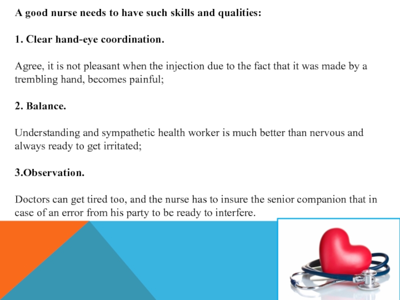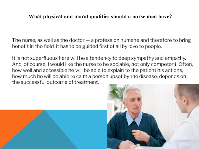 It is not superfluous here will be a tendency to deep sympathy and empathy. And, of course, I would like the nurse to be sociable, not only competent. Often, how well and accessible he will be able to explain to the patient his actions, how much he will be able to calm a person upset by the disease, depends on the successful outcome of treatment.