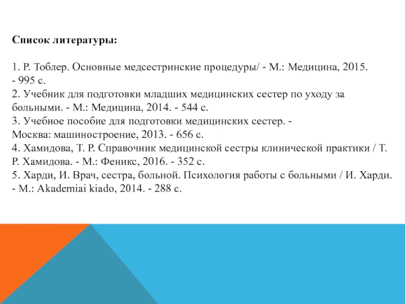 1. Р. Тоблер. Основные медсестринские процедуры/ - М.: Медицина, 2015.