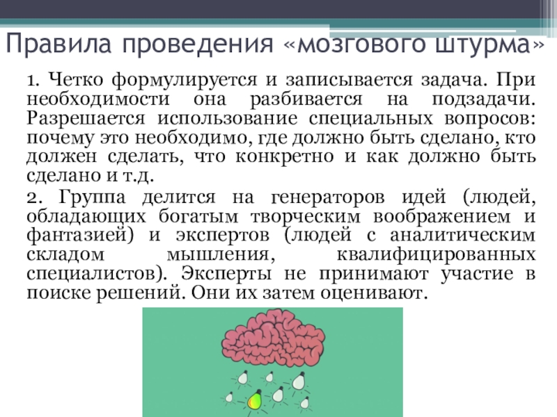 2. Группа делится на генераторов идей (людей, обладающих богатым творческим воображением и фантазией) и экспертов (людей с аналитическим складом мышления, квалифицированных специалистов). Эксперты не принимают участие в поиске решений. Они их затем оценивают.