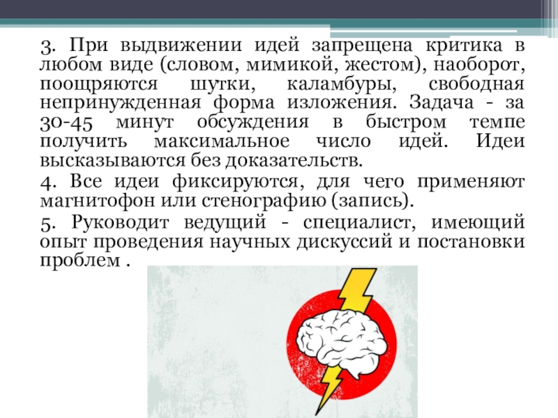 3. При выдвижении идей запрещена критика в любом виде (словом,