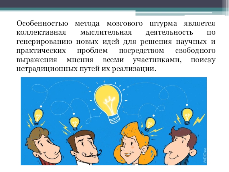 Особенностью метода мозгового штурма является коллективная мыслительная деятельность по генерированию