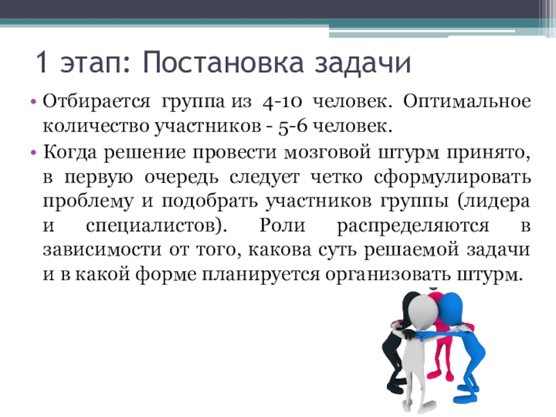 очередь следует четко сформулировать проблему и подобрать участников группы (лидера и специалистов). Роли распределяются в зависимости от того, какова суть решаемой задачи и в какой форме планируется организовать штурм.
