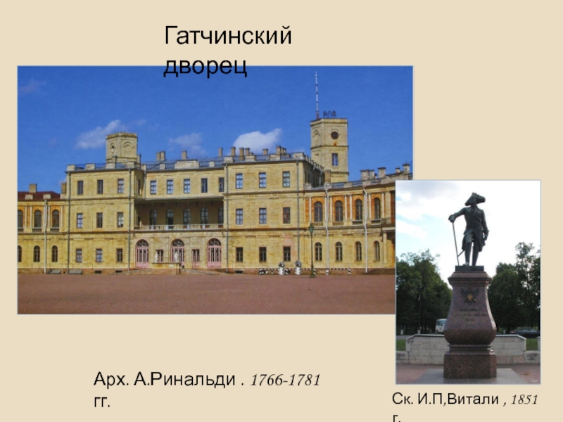 Гатчинский дворецАрх. А.Ринальди . 1766-1781 гг.Ск. И.П,Витали , 1851 г.