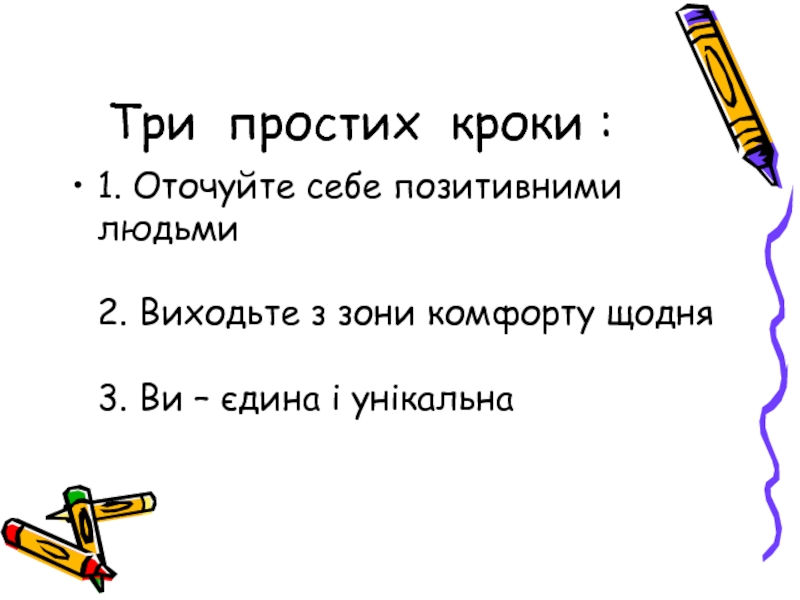 Три простих кроки :1. Оточуйте себе позитивними людьми  2. Виходьте з зони комфорту щодня  3.