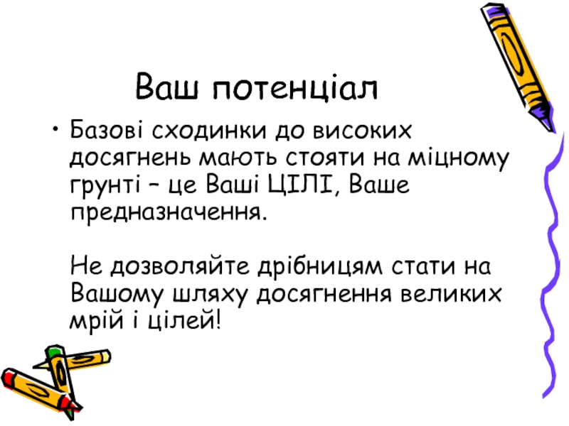 Ваш потенціалБазові сходинки до високих досягнень мають стояти на міцному грунті – це Ваші ЦІЛІ, Ваше предназначення.