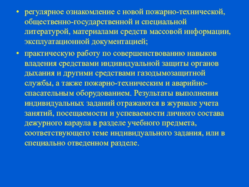 средствами индивидуальной защиты органов дыхания и другими средствами газодымозащитной службы, а также пожарно-техническим и аварийно-спасательным оборудованием. Результаты выполнения индивидуальных заданий отражаются в журнале учета занятий, посещаемости и успеваемости личного состава дежурного караула в разделе учебного предмета, соответствующего теме индивидуального задания, или в специально отведенном разделе.
