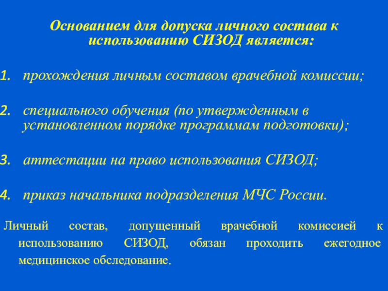 Личный состав, допущенный врачебной комиссией к использованию СИЗОД, обязан проходить ежегодное медицинское обследование.