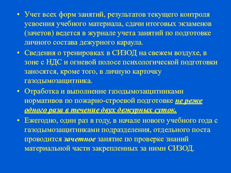 Ежегодно, один раз в году, в начале нового учебного года с газодымозащитниками подразделения, отдельного поста проводится зачетное занятие по проверке знаний материальной части закрепленных за ними СИЗОД.