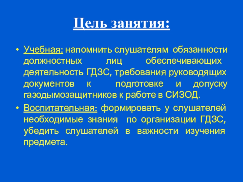 Воспитательная: формировать у слушателей необходимые знания по организации ГДЗС, убедить слушателей в важности изучения предмета.