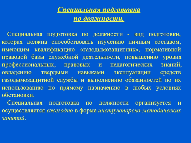 Специальная подготовка по должности организуется и осуществляется ежегодно в форме инструкторско-методических занятий.