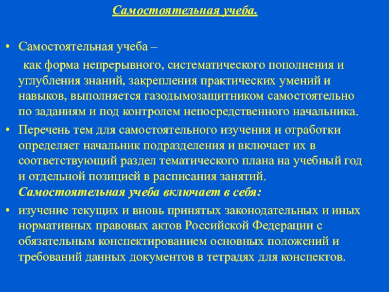 Перечень тем для самостоятельного изучения и отработки определяет начальник подразделения и включает их в соответствующий раздел тематического плана на учебный год и отдельной позицией в расписания занятий. Самостоятельная учеба включает в себя: