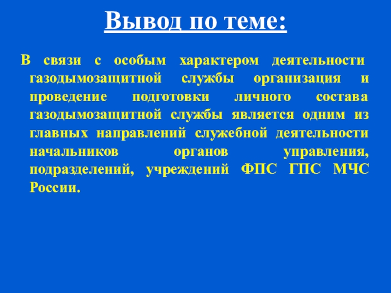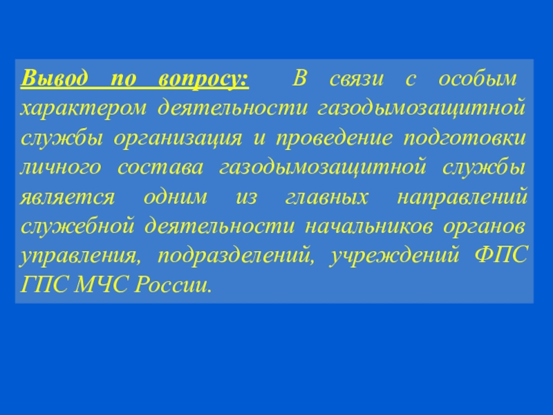 Слайд 25Вывод по вопросу: В связи с особым характером деятельности газодымозащитной
