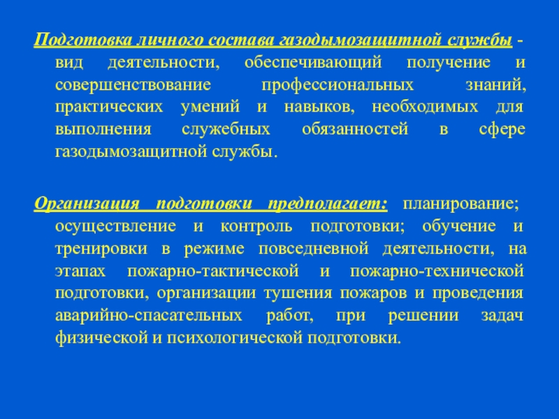 Слайд 13Подготовка личного состава газодымозащитной службы - вид деятельности, обеспечивающий получение