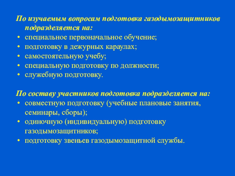 Слайд 14По изучаемым вопросам подготовка газодымозащитников подразделяется на: