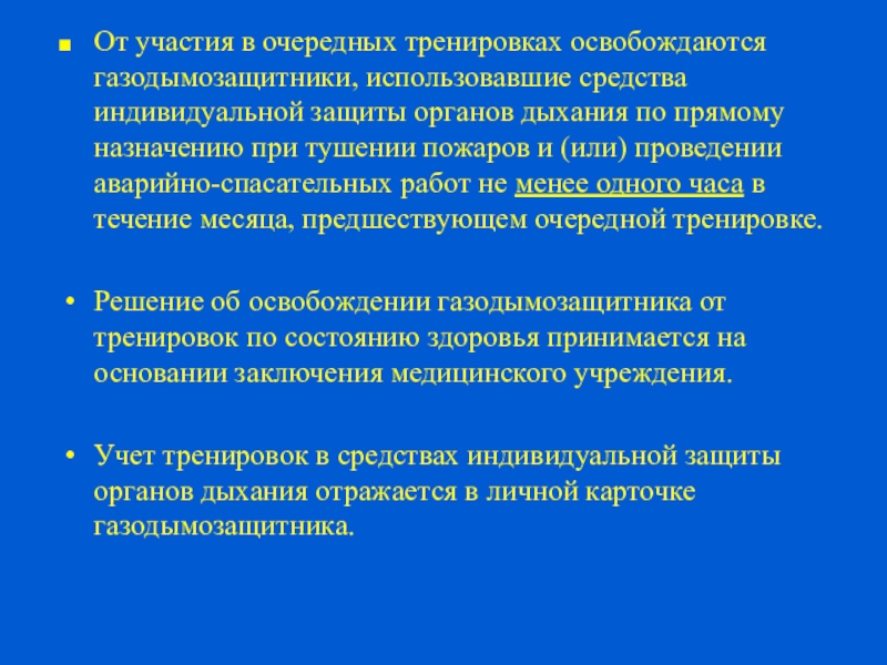 Слайд 20От участия в очередных тренировках освобождаются газодымозащитники, использовавшие средства индивидуальной