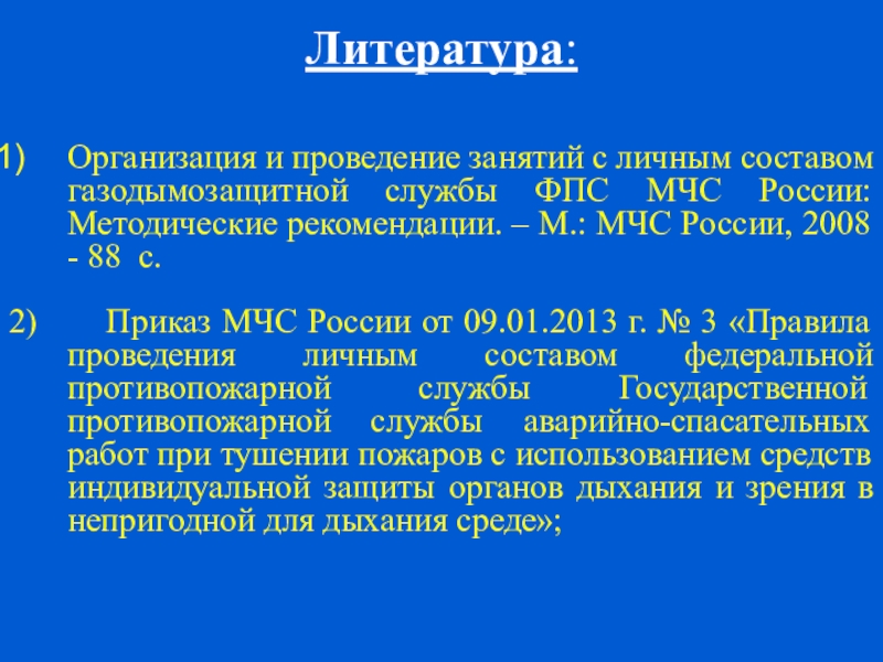 2) Приказ МЧС России от 09.01.2013 г. № 3 «Правила проведения личным составом федеральной противопожарной службы Государственной противопожарной службы аварийно-спасательных работ при тушении пожаров с использованием средств индивидуальной защиты органов дыхания и зрения в непригодной для дыхания среде»;