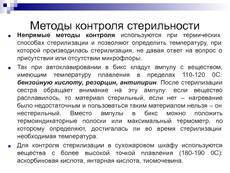 Так при автоклавировании в бикс кладут ампулу с веществом, имеющим температуру плавления в пределах 110-120 0С: бензойную кислоту, резорцин, антипирин. После стерилизации сестра обращает внимание на эту ампулу: если вещество расплавилось, то материал стерильный, если нет – нагревание было недостаточным и пользоваться таким материалом нельзя – он нестерильный. Вместо ампулы в бикс можно положить термоиндикаторные полоски или максимальный термометр, по которому определяют, достигалась ли во время стерилизации необходимая температура.