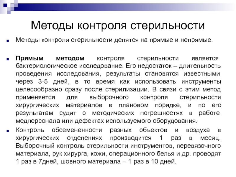 Прямым методом контроля стерильности является бактериологическое исследование. Его недостаток –