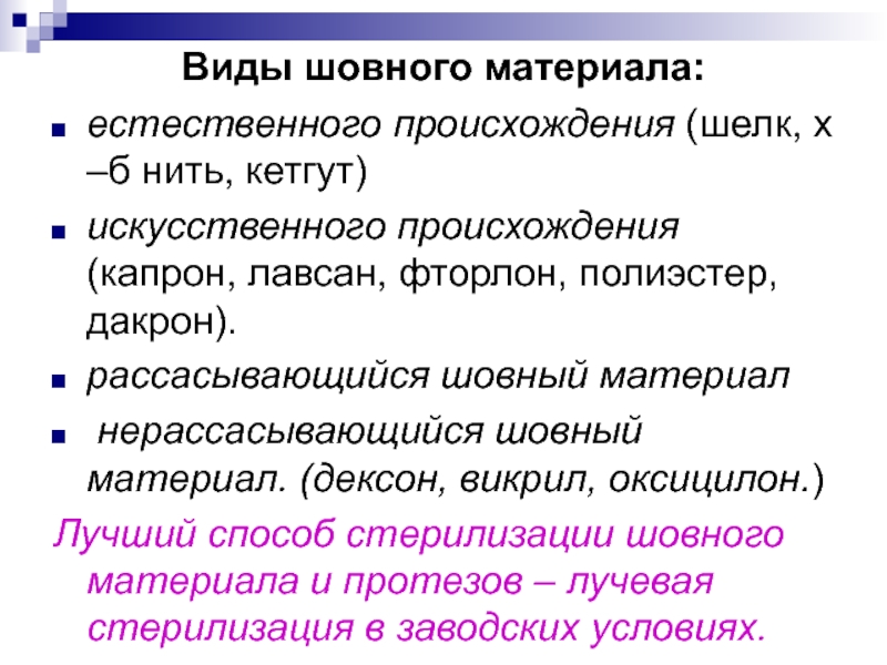 Лучший способ стерилизации шовного материала и протезов – лучевая стерилизация в заводских условиях.