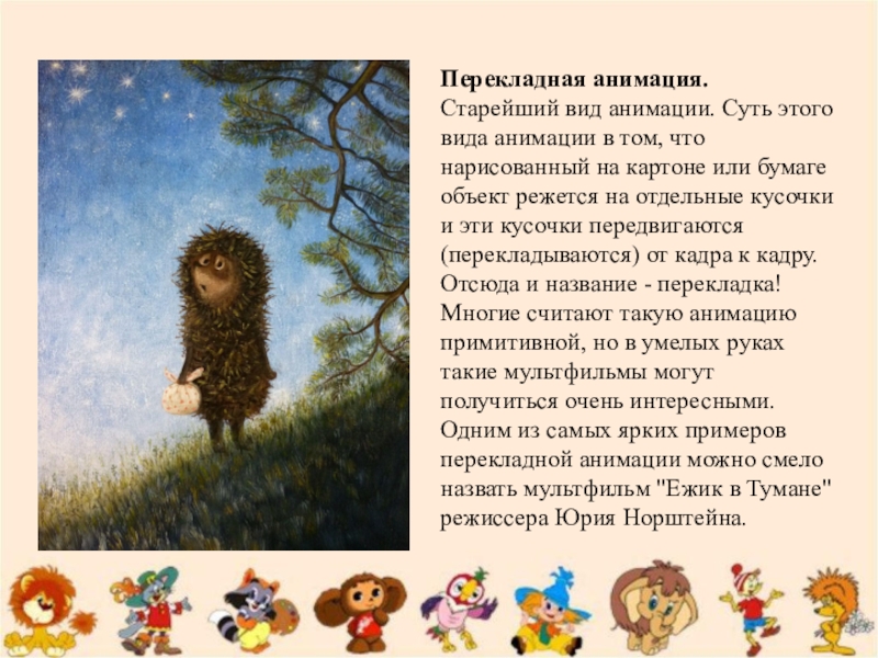 кусочки и эти кусочки передвигаются (перекладываются) от кадра к кадру. Отсюда и название - перекладка! Многие считают такую анимацию примитивной, но в умелых руках такие мультфильмы могут получиться очень интересными. Одним из самых ярких примеров перекладной анимации можно смело назвать мультфильм "Ежик в Тумане" режиссера Юрия Норштейна.