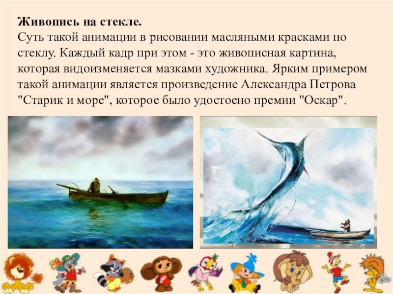 видоизменяется мазками художника. Ярким примером такой анимации является произведение Александра Петрова "Старик и море", которое было удостоено премии "Оскар".