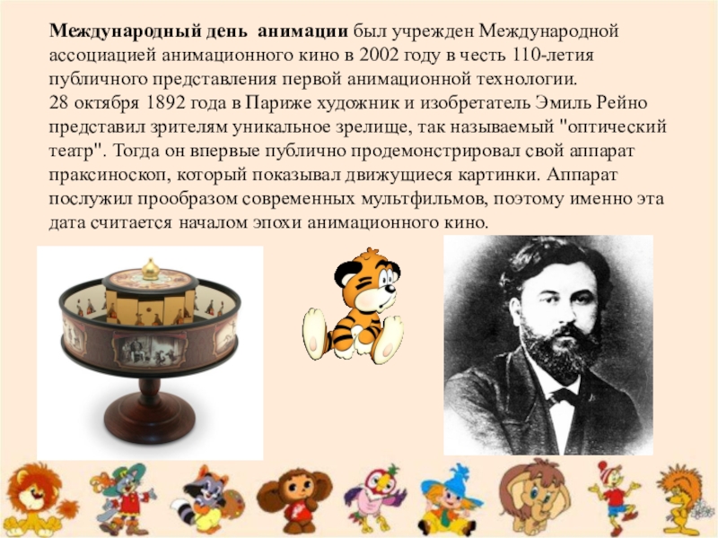 октября 1892 года в Париже художник и изобретатель Эмиль Рейно представил зрителям уникальное зрелище, так называемый "оптический театр". Тогда он впервые публично продемонстрировал свой аппарат праксиноскоп, который показывал движущиеся картинки. Аппарат послужил прообразом современных мультфильмов, поэтому именно эта дата считается началом эпохи анимационного кино.
