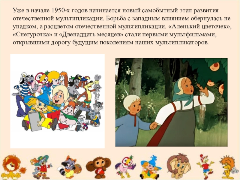 расцветом отечественной мультипликации. «Аленький цветочек», «Снегурочка» и «Двенадцать месяцев» стали первыми мультфильмами, открывшими дорогу будущим поколениям наших мультипликаторов.
