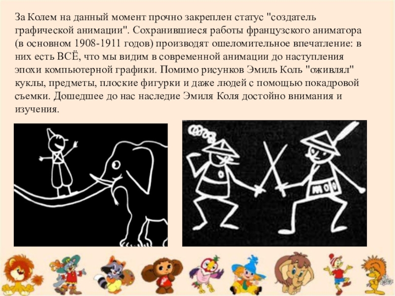 ошеломительное впечатление: в них есть ВСЁ, что мы видим в современной анимации до наступления эпохи компьютерной графики. Помимо рисунков Эмиль Коль "оживлял" куклы, предметы, плоские фигурки и даже людей с помощью покадровой съемки. Дошедшее до нас наследие Эмиля Коля достойно внимания и изучения.