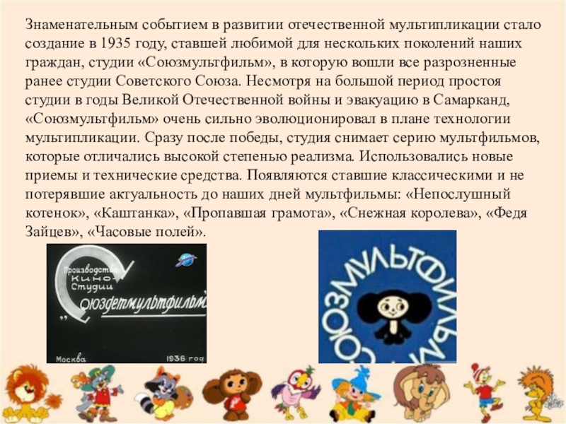 в которую вошли все разрозненные ранее студии Советского Союза. Несмотря на большой период простоя студии в годы Великой Отечественной войны и эвакуацию в Самарканд, «Союзмультфильм» очень сильно эволюционировал в плане технологии мультипликации. Сразу после победы, студия снимает серию мультфильмов, которые отличались высокой степенью реализма. Использовались новые приемы и технические средства. Появляются ставшие классическими и не потерявшие актуальность до наших дней мультфильмы: «Непослушный котенок», «Каштанка», «Пропавшая грамота», «Снежная королева», «Федя Зайцев», «Часовые полей».