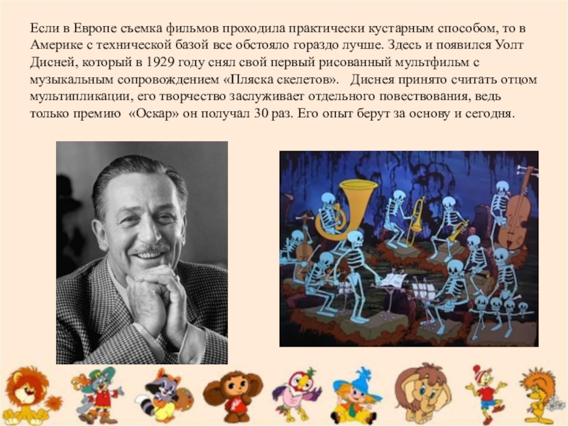 и появился Уолт Дисней, который в 1929 году снял свой первый рисованный мультфильм с музыкальным сопровождением «Пляска скелетов». Диснея принято считать отцом мультипликации, его творчество заслуживает отдельного повествования, ведь только премию «Оскар» он получал 30 раз. Его опыт берут за основу и сегодня.