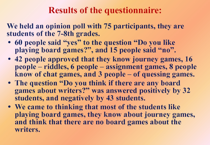 The question “Do you think if there are any board games about writers?” was answered positively by 32 students, and negatively by 43 students.