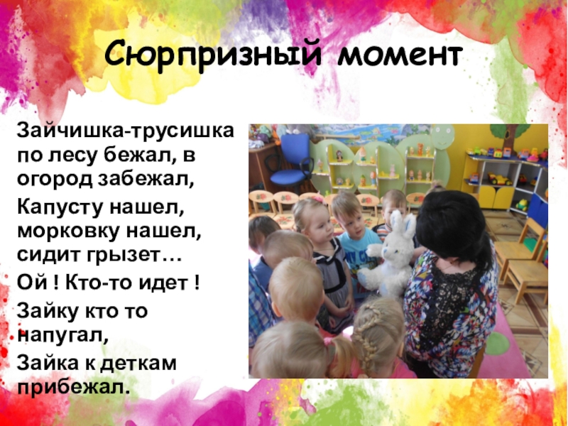 Сюрпризный моментЗайчишка-трусишка по лесу бежал, в огород забежал,Капусту нашел, морковку нашел, сидит грызет…Ой ! Кто-то идет !Зайку