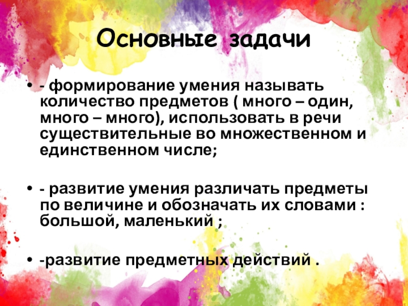 Основные задачи- формирование умения называть количество предметов ( много – один, много – много), использовать в речи существительные во множественном и единственном числе;- развитие умения различать предметы по величине и обозначать