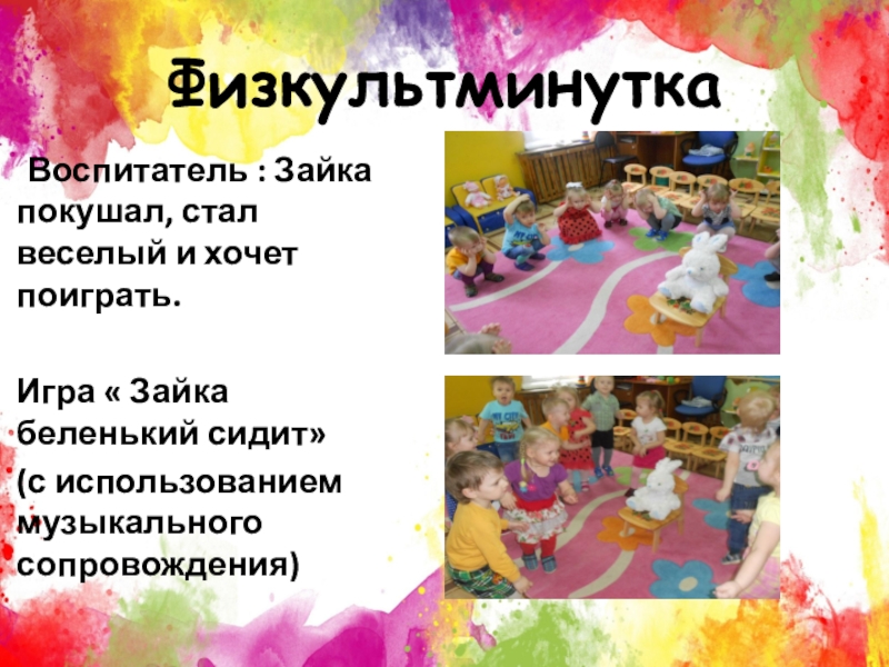 Физкультминутка Воспитатель : Зайка покушал, стал веселый и хочет поиграть.Игра « Зайка беленький сидит» (с использованием музыкального