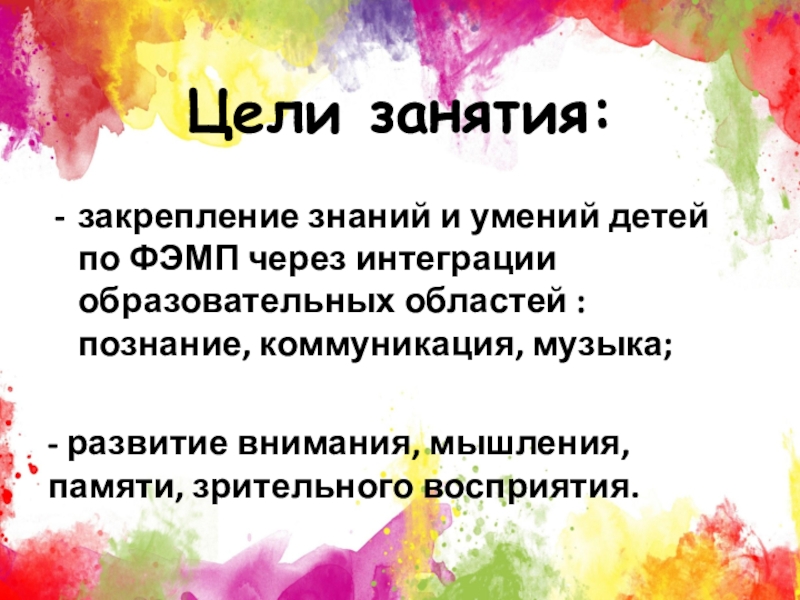 Цели занятия: закрепление знаний и умений детей по ФЭМП через интеграции образовательных областей : познание, коммуникация, музыка;-