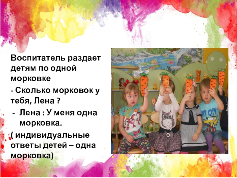 Воспитатель раздает детям по одной морковке - Сколько морковок у тебя, Лена ?Лена : У меня одна