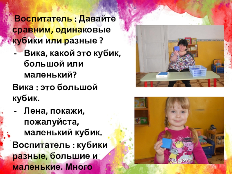 Воспитатель : Давайте сравним, одинаковые кубики или разные ?Вика, какой это кубик, большой или маленький? Вика