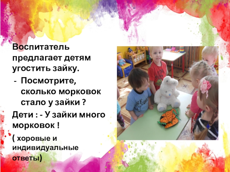 Воспитатель предлагает детям угостить зайку.Посмотрите, сколько морковок стало у зайки ?Дети : - У зайки много морковок