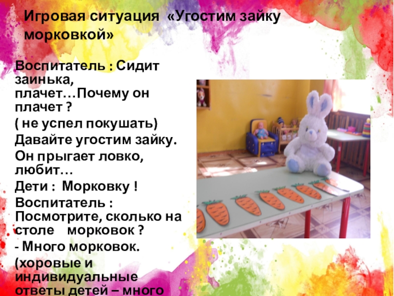 Слайд 7Игровая ситуация «Угостим зайку морковкой»