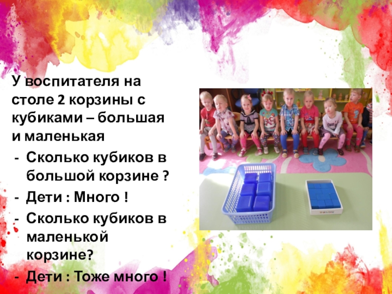 Слайд 11У воспитателя на столе 2 корзины с кубиками – большая