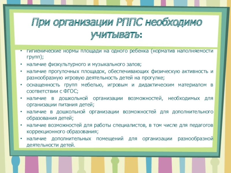 наличие в дошкольной организации возможностей, необходимых для организации питания детей;