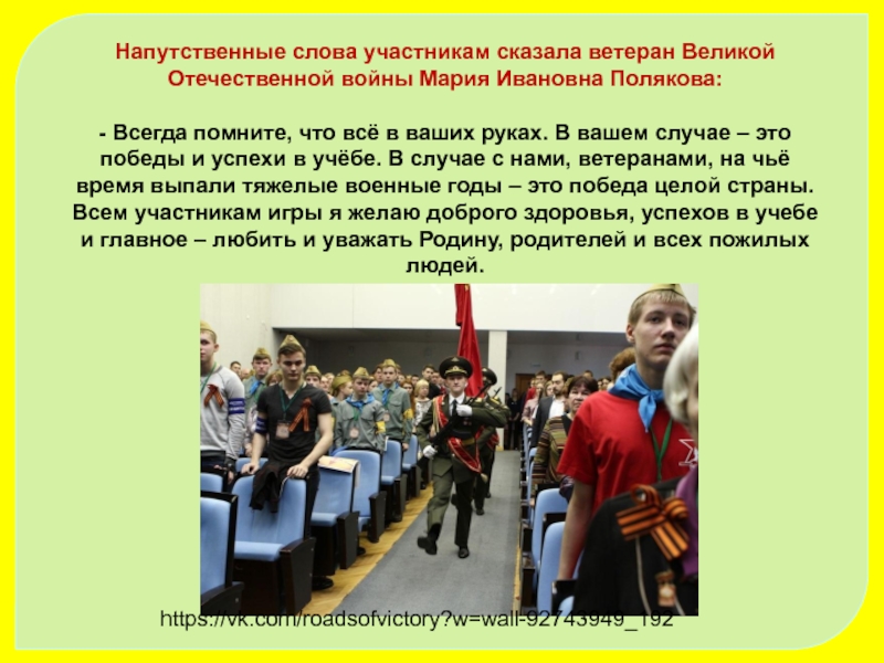 Слайд 4Напутственные слова участникам сказала ветеран Великой Отечественной войны Мария Ивановна