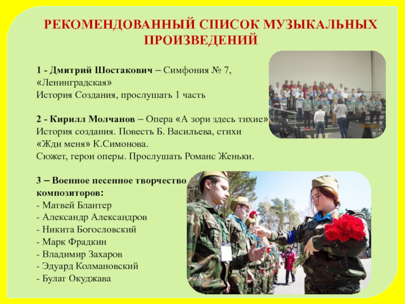 Слайд 13РЕКОМЕНДОВАННЫЙ СПИСОК МУЗЫКАЛЬНЫХ ПРОИЗВЕДЕНИЙ