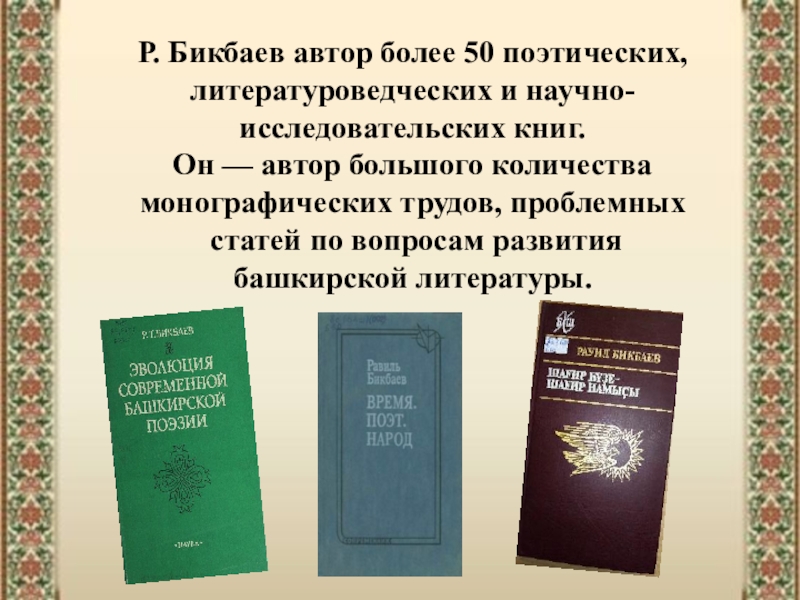 Слайд 4Р. Бикбаев автор более 50 поэтических, литературоведческих и научно-исследовательских книг.