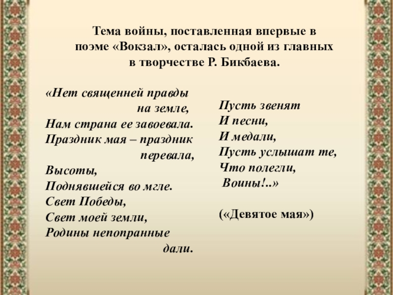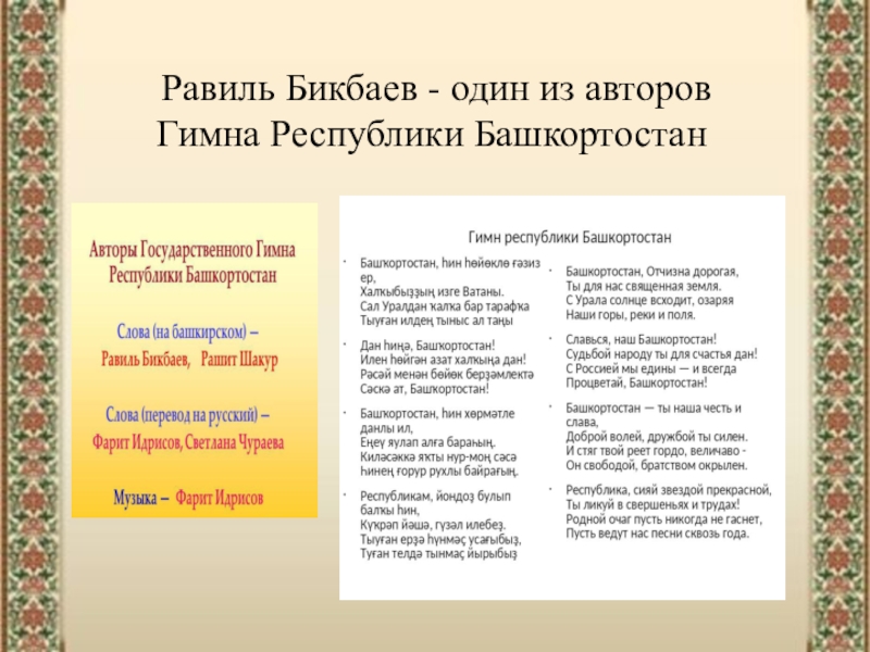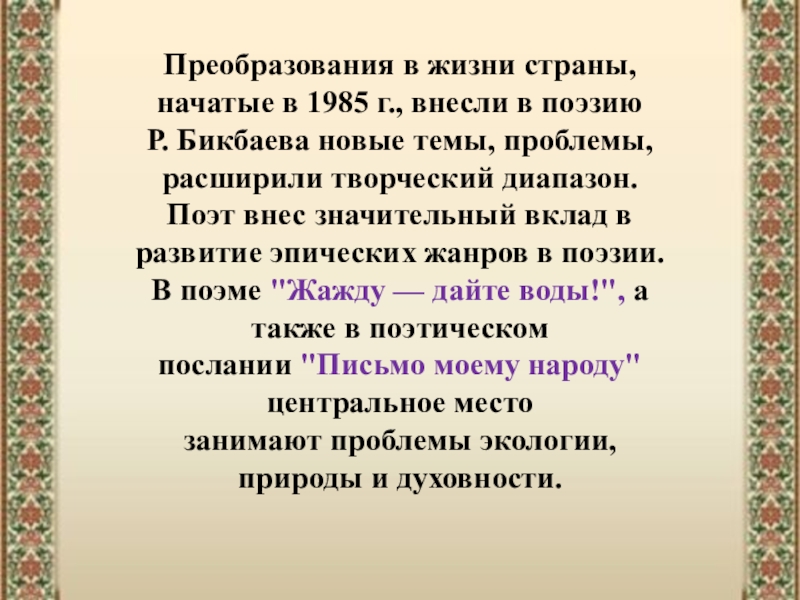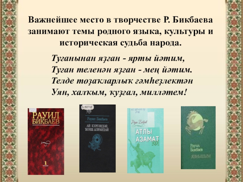 Слайд 11Важнейшее место в творчестве Р. Бикбаева занимают темы родного языка,